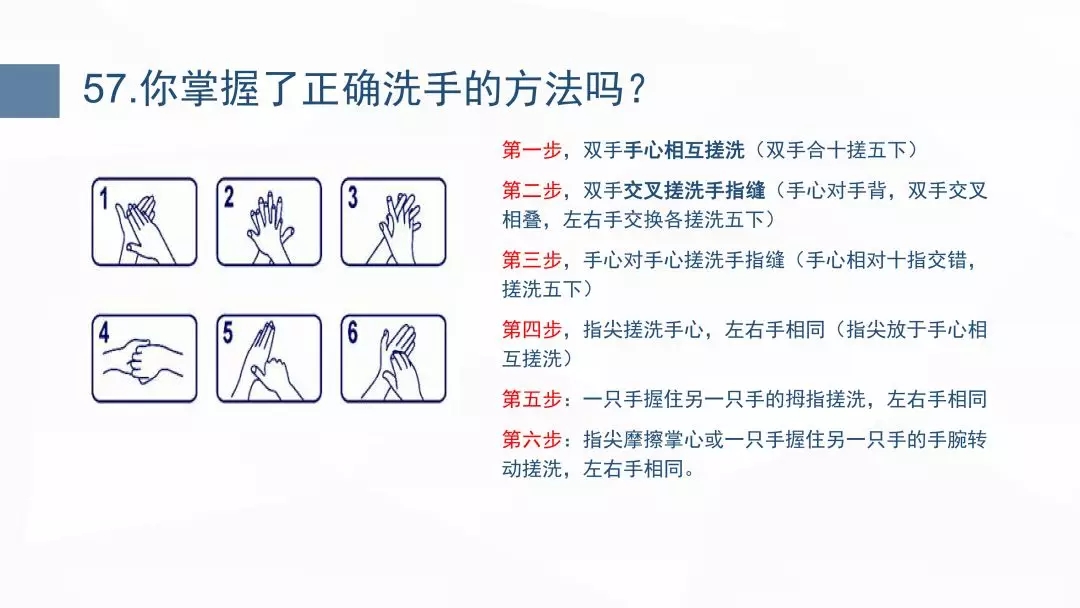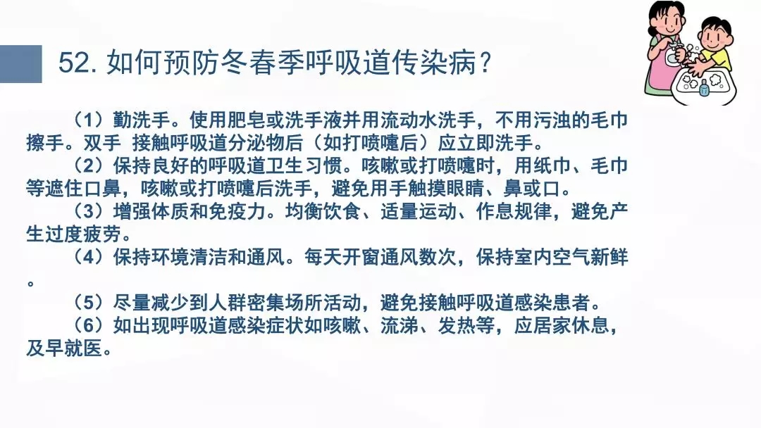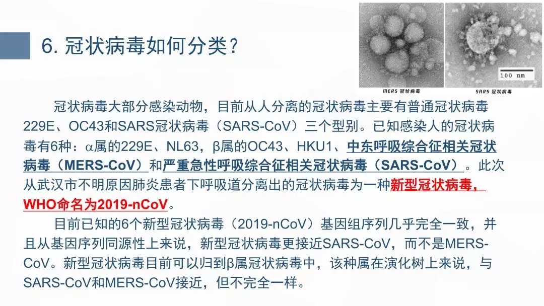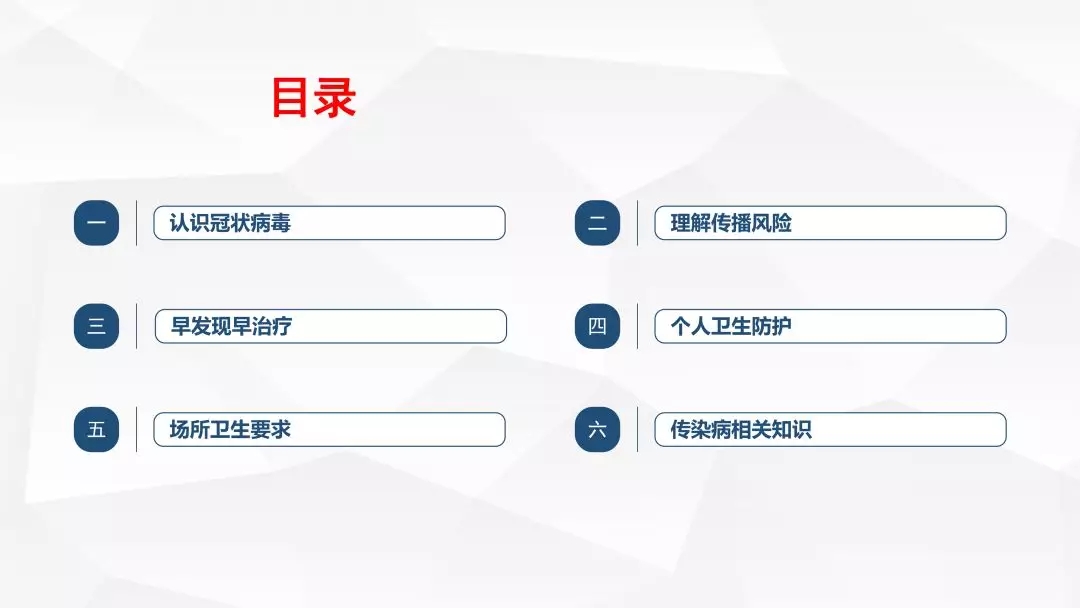 认识冠状病毒、理解传播风险、早发现早 治疗、个人卫生防护、场所卫生要求和传染病相关知识等六部分