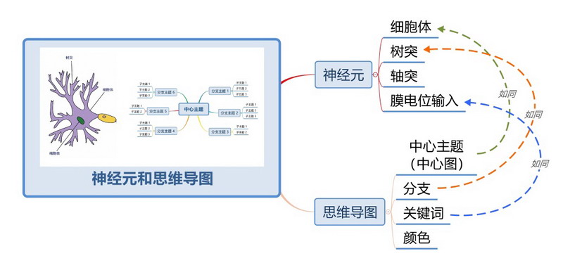 思维导图的中心主题如同神经元的细胞体,思维导图的分支如同神经元的树突,思维导图的关键词如同神经元的膜电位输入。