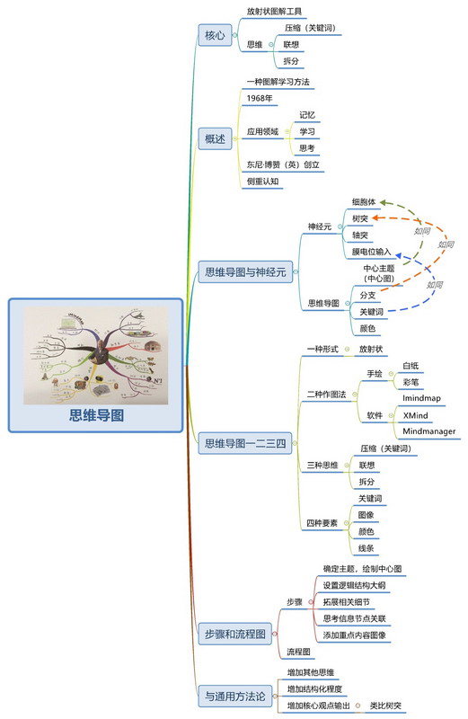 思维导图是一种将思维形象化的方法。我们知道放射性思考是人类大脑的自然思考方式,每一种进入大脑的资料,不论是感觉、记忆或是想法——包括文字、数字、符码、香气、食物、线条、颜色、意象、节奏、音符等,都可以成为一个思考中心,并由此中心向外发散出成千上万的关节点,每一个关节点代表与中心主题的一个连结,而每一个连结又可以成为另一个中心主题,再向外发散出成千上万的关节点,呈现出放射性立体结构,而这些关节的连结可以视为您的记忆,就如同大脑中的神经元一样互相连接,也就是您的个人数据库。
