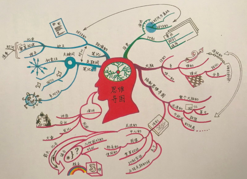 下图是《启动大脑》中的一张思维导图,包含了线条、关键词、图像和颜色(如图10所示)。