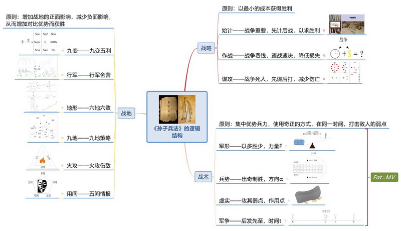 下图为《孙子兵法》的思维导图,我使用拆分的方法,将《孙子兵法》的13篇分为战略、战术和战地3个部分,然后概括每一部分的核心原则。接下来分析每一篇的主要内容,并配上了一张关键图片来阐释(如图16所示)。