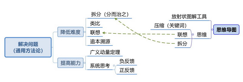 解决问题有两大方法(也称为通用方法论),分别为提高能力和降低难度。提高能力有广义动量定理和系统思考两种方法,其中系统思考包括负反馈和正反馈;降低问题难度有拆分、联想、类比、追本溯源四种方法。思维导图可以降低问题难度,这一点可以使用通用方法论来解释,它和通用方法论都使用了拆分和联想两种降低难度的方法。