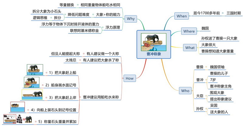 在关键词的使用上,如果只是自己看的话,那么可以尽量简化,比如称象的步骤,可以写成:象上船,画记号,象下船,装石头,称石头。但是如果这张思维导图别人也需要看的话,那么还是在把问题表述清楚的前提下进行压缩,比如称象的步骤为:1)把大象赶上船;2)船身画水面记号;3)把大象赶上岸;4)向船上装石头到记号位置;5)称量石头重量并累加。