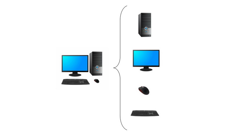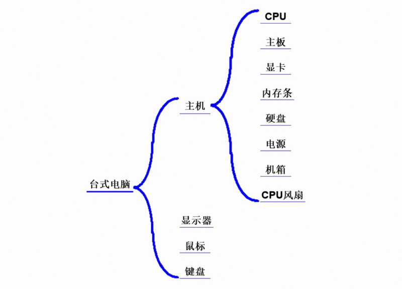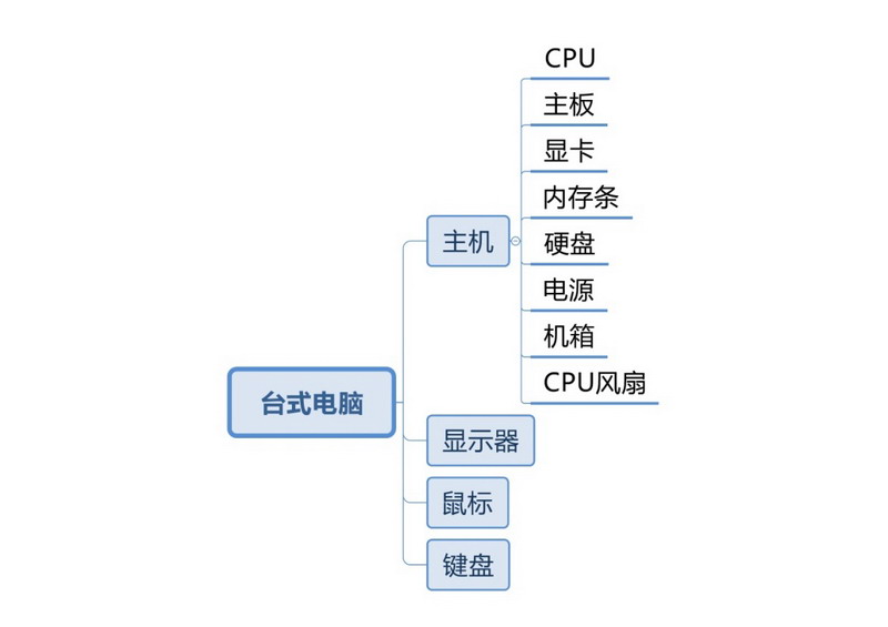 我们可以使用括号图来对事物进行拆分,比如台式电脑可以拆分成主机、显示器、鼠标和键盘四个部分(如图49所示)。