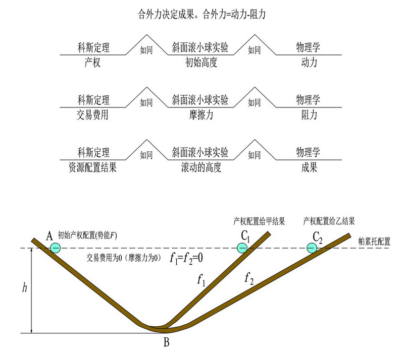 科斯定理包括三个要素:产权、交易费用和资源的配置结果,这和物理学中斜面滚小球实验,以及合外力决定成果类似。滚小球实验中的三个要素包括:小球的初始高度、斜面的摩擦力和小球的滚动高度。合外力决定成果中包括动力、阻力和结果三要素。产权如同小球的初始高度,产权越大,资源配置结果越好,这类似于小球初始高度越高,滚动的高度也越高。交易费用类似于斜面的摩擦力,是资源配置的阻力,这个力越大,资源配置结果越不好。如果交易费用为零,那么就如同摩擦力为零,小球可以滚动到原始的高度。资源配置的结果如同滚动小球向右方滚动的高度(如图57所示)。