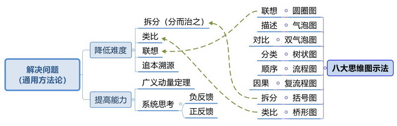 解决问题有两大方法(也称为通用方法论),分别为提高能力和降低难度。提高能力有广义动量定理和系统思考两种方法,其中系统思考包括负反馈和正反馈;降低问题难度有拆分、联想、类比、追本溯源四种方法。八大思维图示法可以降低问题难度,这一点可以使用通用方法论来解释,它和通用方法论都使用了拆分、联想和类比三种降低难度的方法。另外,图解方式可以充分调动右脑,使得左右脑同时工作,效率大大提高(如图58所示)。