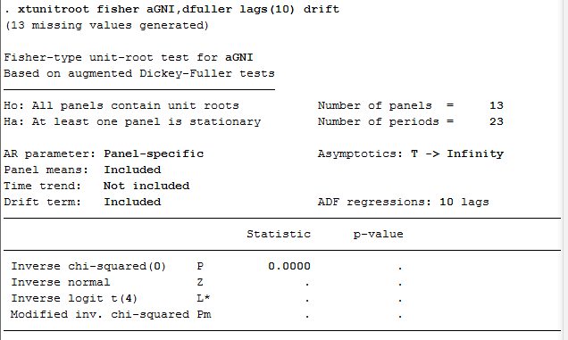 用stata对人均GNI做ADF-Fisher检验,滞后阶数采取