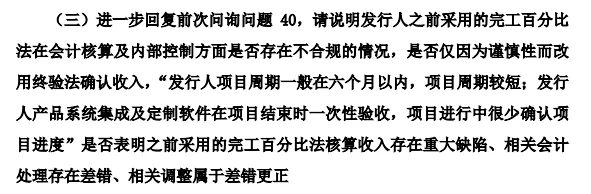 报告期内,公司项目周期一般在六个月以内,项目周期较短;公司产品系统集成及定制软件在项目结束时一次性验收,项目进行中很少确认项目进度。公司原先采用完工百分比中的工作量法,按照已经提供的工作量占应提供的工作总量的比例确定提供劳务交易的完工进度,对项目完工进度的测量可能存在误差。