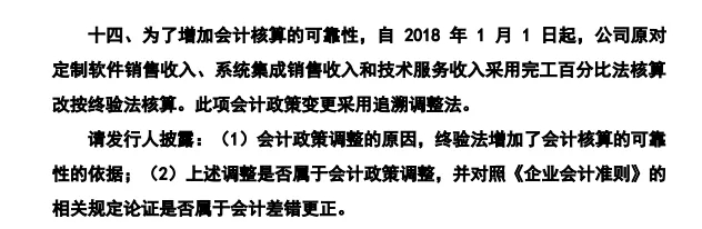 1. 会计政策调整的原因公司董事会分别从公司项目周期、项目验收次数及完工百分比法与终验法的差异等几方面对公司收入确认的会计政策进行充分论述,鉴于拟上市公司申报会计信息的谨慎性,公司于第二届董事会第三次会议及 2018 年年度股东大会审议通过《关于会计政策变更》议案,自 2018 年 1 月 1 日起,公司收入确认会计政策由原先的完工百分比法调整为终验法核算,且此项会计政策变更采用追溯调整法。