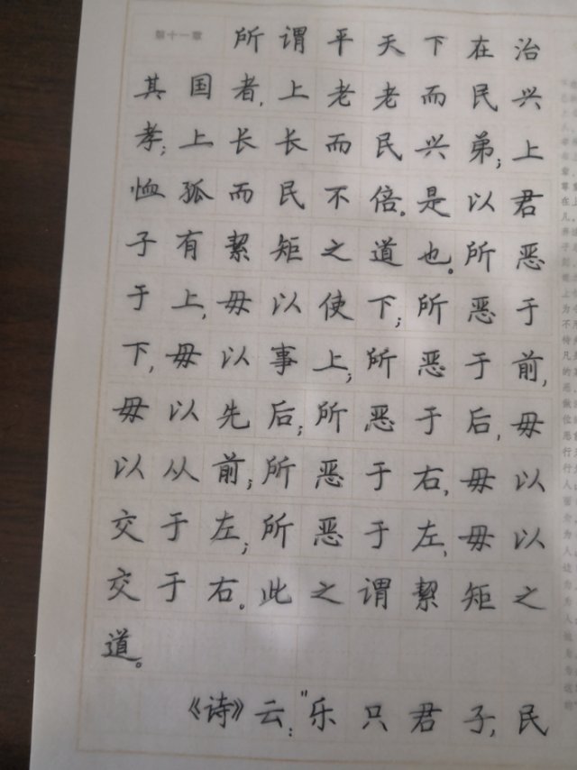 第十一章所谓平天下在治其国者,上老老而民兴孝;上长长而民兴弟;上恤弧而民不倍。是以君子有絜矩之道也。所恶于上,毋以使下;所恶于下,毋以事上;所恶于前,毋以先后;所恶于后,毋以从前;所恶于右,毋以交于左;所恶于左,母以交于右。此之谓絜矩之道。