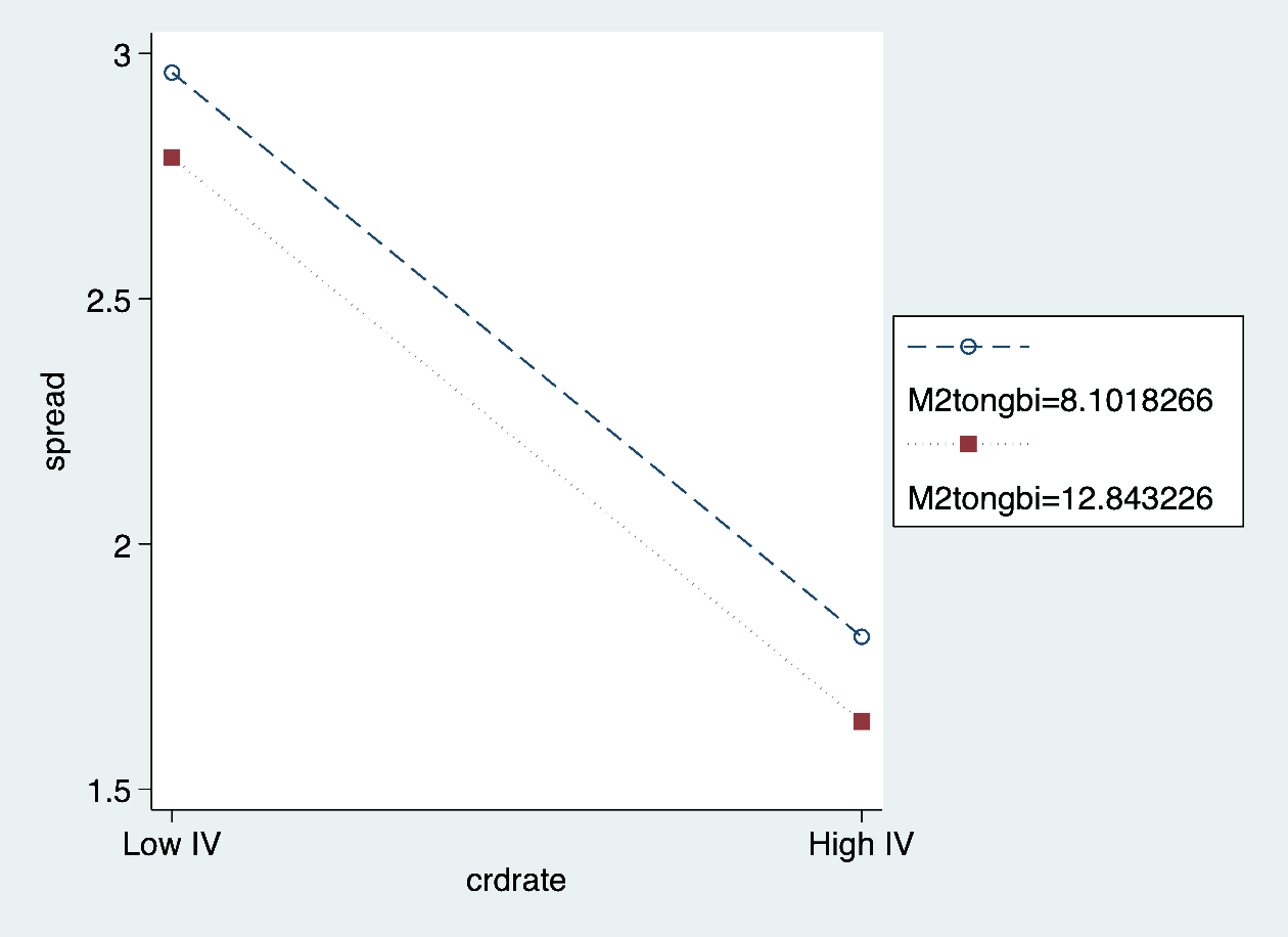reg spread c.c_M2tongbi##c.crdrate 全部控制变量 i.IND 作为第一步,画出了图2,出现了轻微的斜率不同