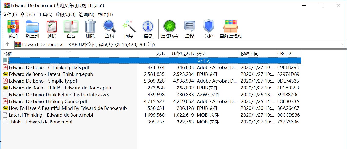 Edward De bono的水平思考在Entrepreneur的Innovation和Creative中用到很多,我把在网上能搜索到的著作打了个包,全都是英文版。文件格式有PDF, EPUB,MOBI, AZW3,希望大家见谅。