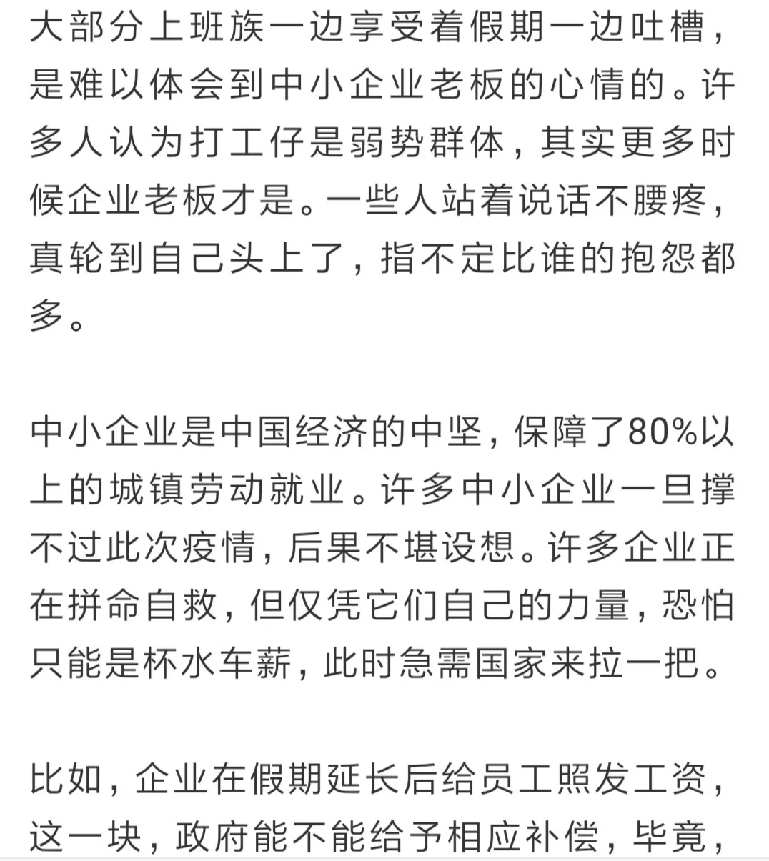 大部分上班族一边享受着假期一边吐槽,是难以体会到中小企业老板的心情的。许多人认为打工仔是弱势群体,其实更多时候企业老板才是。一些人站着说话不腰疼,真轮到自己头上了,指不定比谁的抱怨都多。