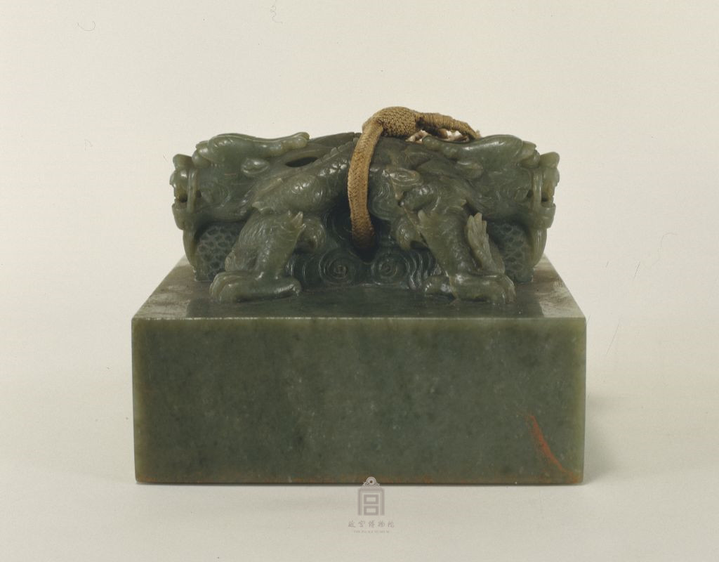 青玉质,交龙纽方形玺,汉文篆书。附系黄色绶带。