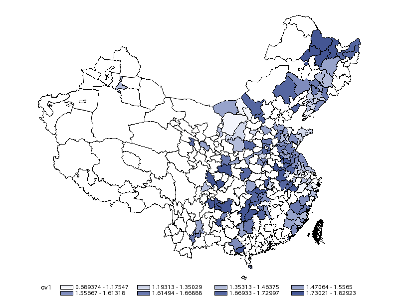 比如说 我绘制了地级市层面的中国地图,下面的地图,颜色越深的地方表示数值越大,但是存在一个问题,就是西部地区大部分都是白色,这个白色既包括了数值最小的范围内的地级市也包括了没有数据的地级市,这样就造成了混淆,都是白色的地方无法区分哪些地方有数据哪些地方是没有数据的,比如西藏自治区的数据是缺失的,所以我想用其他不同的颜色来表示西藏,比如西藏的颜色是红色,而其他有数据的地方是默认的渐变的灰蓝色。