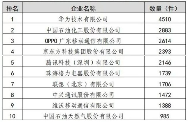 从企业层面看,我国(不含港澳台)发明专利授权量排名前十的企业中,华为以4510件位居榜首,发明专利授权量遥遥领先。此外,OPPO以2614件排名第三,中兴通讯以1472件位居第八,vivo以1388件位居第九。