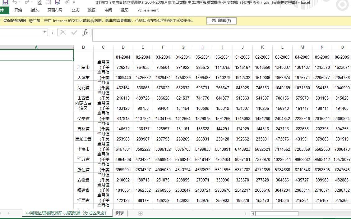 31省市(口径:境内目的地货源地)2004-2019月度进出口总额数据(包括进口总额、出口总额和进出口总额三个指标)