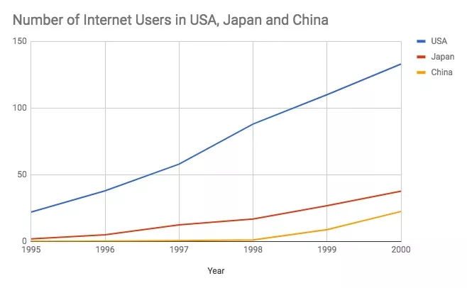 从1999年到2000年,中国的互联网使用人口从约890万增加到了2250万。