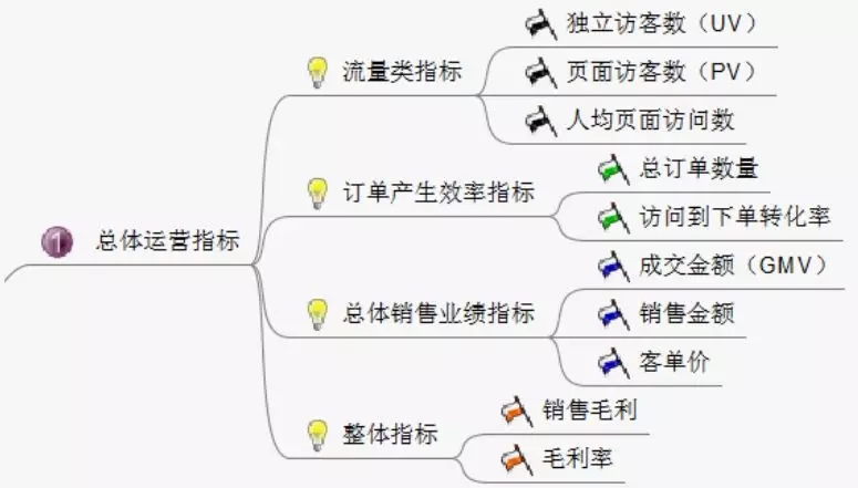 总体运营指标:从流量、订单、总体销售业绩、整体指标进行把控,起码对运营的电商平台有个大致了解,到底运营的怎么样,是亏是赚。
