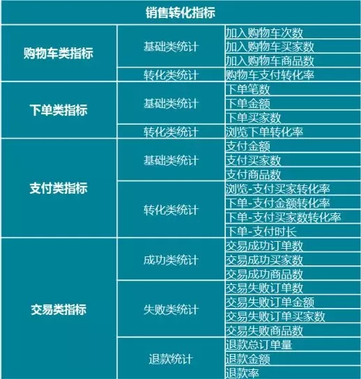 -转化类指标:包括浏览-支付买家转化率(支付买家数/网站访客数)、下单-支付金额转化率(支付金额/下单金额)、下单-支付买家数转化率(支付买家数/下单买家数)和下单-支付时长(下单时间到支付时间的差值)。