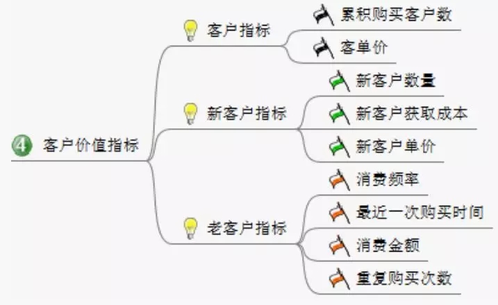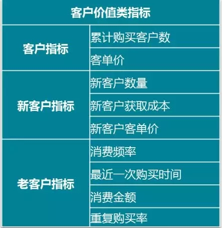 ③老客户指标:常见老客户指标包括消费频率、最近一次购买时间、消费金额和重复购买率。消费频率是指客户在一定期间内所购买的次数;最近一次购买时间表示客户在最近一次购买的时间离现在有多远;客户消费金额指客户在最近一段时间内购买的金额。消费频率越高,最近一次购买时间离现在越近,消费金额越高的客户越有价值。重复购买率则指消费者对该品牌产品或者服务的重复购买次数,重复购买率越多,则反映出消费者对品牌的忠诚度就越高,反之的越低。
