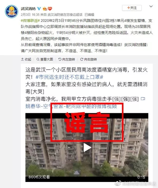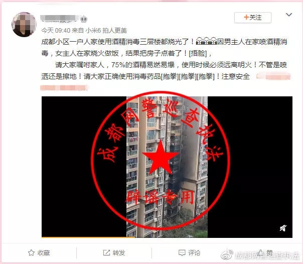 日前,成都网警在网络巡查中发现,个别网民在网络平台称:“成都某小区一户人家因使用消毒酒精不当引燃房屋”,并配发一段房屋燃烧的视频。