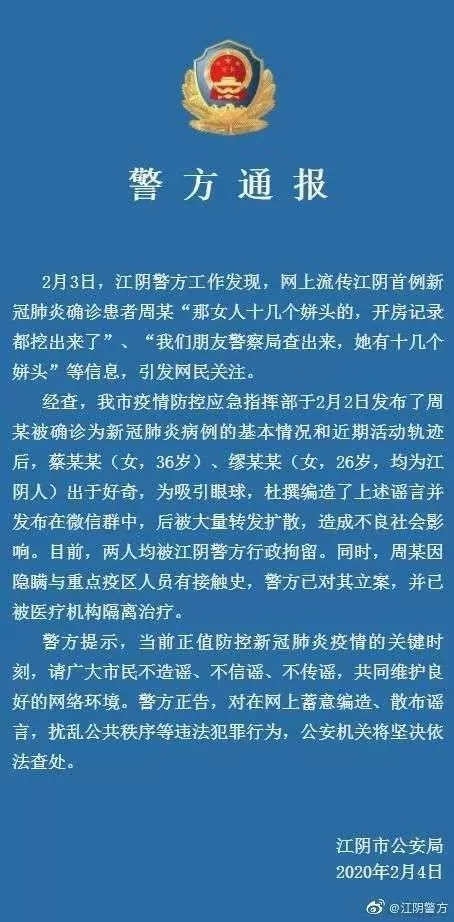 2月3日,江阴警方工作发现,网上流传江阴首例新冠肺炎确诊患者周某“那女人十几个姘头的,开房记录都挖出来了”、“我们朋友警察局查出来, 她有十几个姘头”等信息,引发网民关注。
