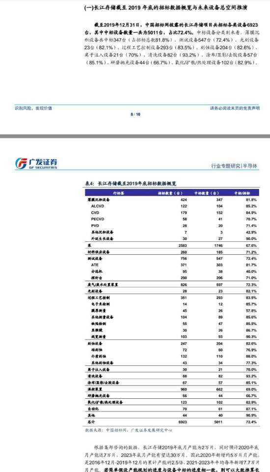 长江存储方面,其成立于 2016 年 7 月,专注于 3D NAND Flash领域,整体投资额 240 亿美元,目前 64 层产品已量产。根据集邦咨询数据,2019 年 Q4 长江存储产能在 2 万片/月,到2020年底有望扩产至7万片/月,2023年目标扩产至30万片/月产能,有望成为全球第三大NAND Flash厂商。合肥长鑫方面,其成立于 2016 年 5 月,专注于 DRAM 领域,整体投资预计超过 1500 亿元。目前一期已投入超过 220 亿元,19nm 8Gb DDR4 已实现量产,产能已达到 2 万片/月,预计 2020 年一季度末达 4 万片/月,三期完成后产能为 36 万片/月,有望成为全球第四大 DRAM 厂商。