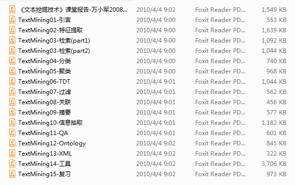 这是文本挖掘的课件,有志于此的朋友们可以好好研究一下。课件很不错,现在我还在研究其中的一些算法...