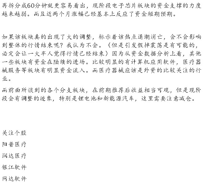 3.从板块的强弱看,暂时只有计算机应用和医疗医药相关板块比较强势,其他板块的缺口还未能完全的补回。其实现在的操作难度很大(除非提前布局医疗医药板块,现在炒补缺口需要一定勇气),板块明显分化,而指数也比较难判断。我只能从暂时没有增量资金进场的角度(增量资金并不是主动买盘的算法),觉得这个盘面还是处于三角收敛的预期。