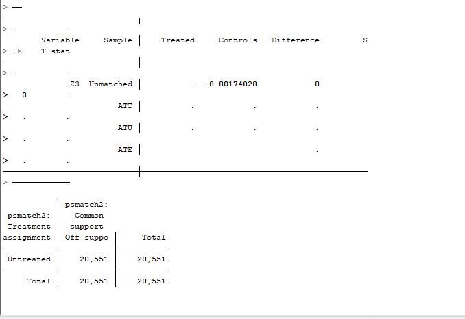 请问下我用stata进行的PSM匹配,为什么结果是这样的呢,什么都没显示