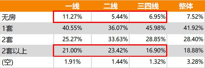 受访对象家庭资产实力强,47%的受访对象拥有2套及2套以上住房。一线、二线和三四线拥有2套及以上住房的受访对象占比分位46%、57%和45%,二线城市的受访对象经济状况最好。从另一个角度看,7.5%的受访对象没有住房,其中一线城市没有住房的比例最高,但也只有11%。