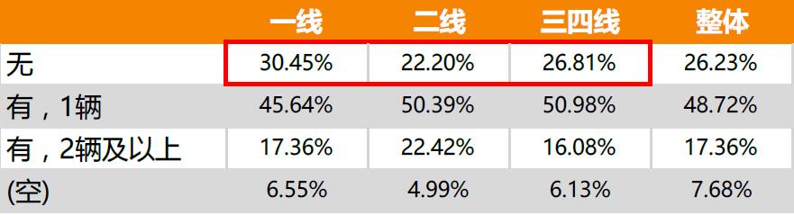 大多数受访对象拥有私家车,17%的家庭拥有2辆以上。66%的受访对象拥有私家车,其中一线城市该比例为63%,要略低于二线和三四线。另一方面,26%的受访对象没有私家车,其中一线城市为30%。