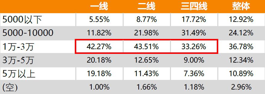被调研对象的家庭收入比较高。整体而言,人数最多的2个收入组分别是1-3万和5000-1万,占比分别为37%和24%,3万以上的收入组占比为23%。一线城市中,人数最多的收入组分别是1-3万,3-5万和5万以上;二线城市中,人数最多的收入组分别是1-3万,5000-1万和3-5万;三四线城市中,人数最多的收入组分别是1-3万、5000-1万和5000以下。