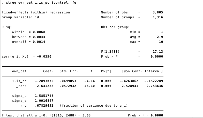 xtreg own_pat i.is_pc ${control}, fe