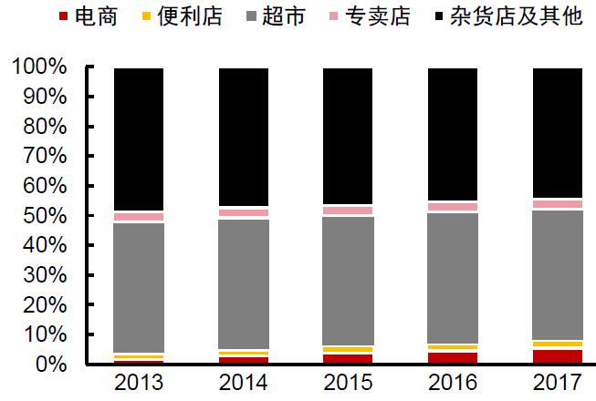图1:2013-2017年餐饮各渠道占比,电商占餐饮零售渠道提升至5.5%