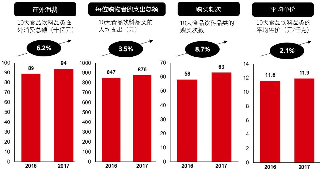 图3:2017年一二线城市10大食品饮料品类在外消费总额增长6.2%