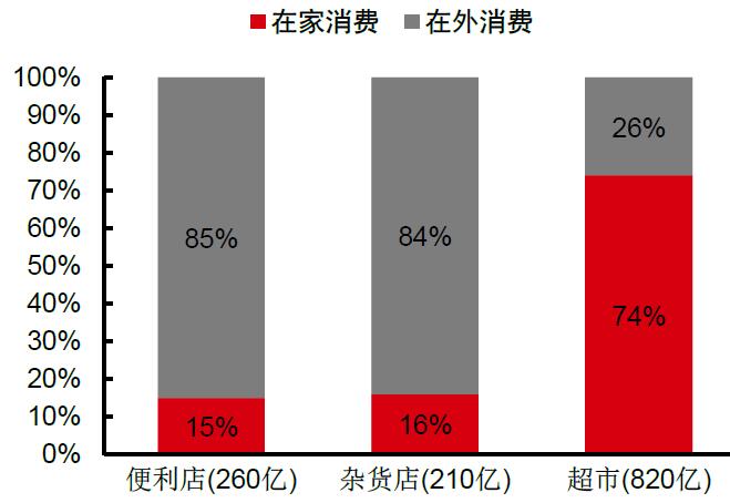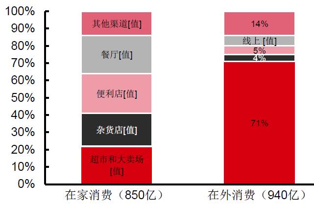 电商和外卖的高速发展反映了消费者习惯的变迁,对于就餐便利性和时效性的需求日益提升,而与之相对的是传统渠道的更替。根据中为智研研究,2017年大卖场的家庭年均购物次数同比下滑4.5%至21.3,大卖场渗透率下滑0.4pct至77%,在家消费/烹饪的比例持续下降。相比之下,在外消费成为了传统渠道中更具潜力的一部分。凯度研究显示,2017年国内一、二线城市10大食品饮料品类在外消费总额增长约6.2%,购物频次是主要推动因素,同比增长8.7%。零售渠道中便利店和杂货店的在外食品消费占其收入比例85%和84%,餐饮和零售界限趋于模糊化。