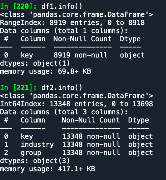 现在需要按df1和df2的key,将df2的内容合并到df1中,建立一个8919行3列的DataFrame:df3。
