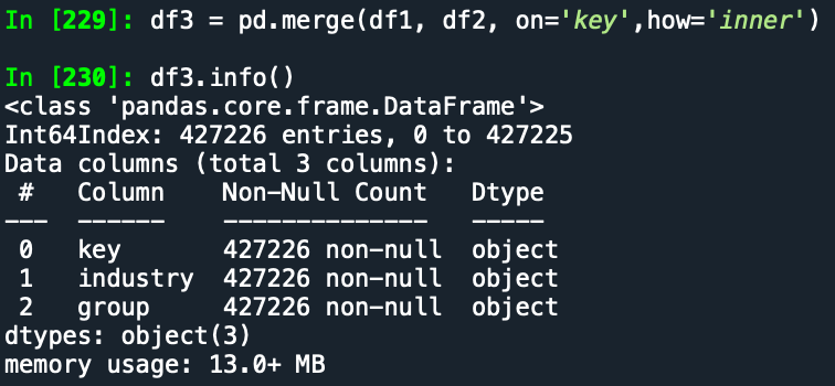 我使用的命令:df3 = pd.merge(df1, df2, on='key', how='inner'),但是结果却是一个427226行3列的DataFrame...如下: