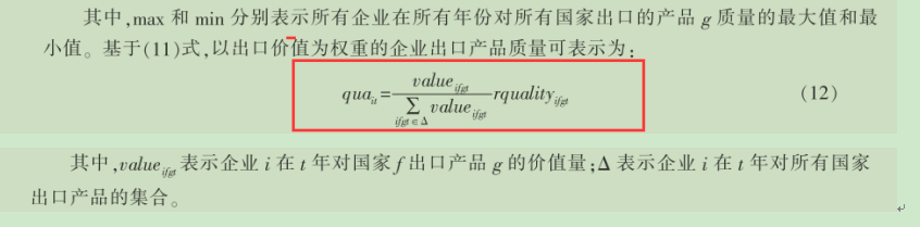 即:如果先计算出了企业i在t年出口到j国的属产品类别g的产品质量,qijgt,那么,如何按照产品g的出口份额加权到企业层面的出口产品质量呢?即得到Qit。