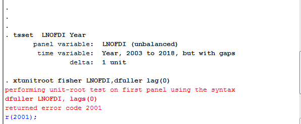 用fisher做单位根检验,一直出现performing unit-root test on first panel using the syntax 是什么原因啊,大神帮帮忙!