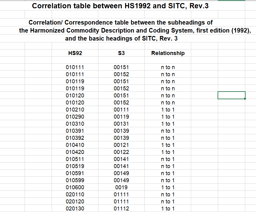 求问大神们,我现在想把HS92版的4位编码转化成SITC3位的编码,后面relationship里的n对n,n对1和1对1是什么意思呢,具体要怎么进行转化呢。小女子先谢过各位大佬,请求大家指教~!!
