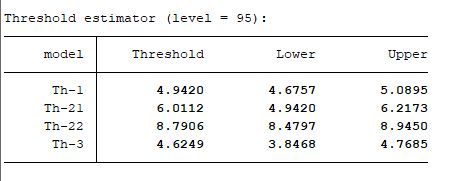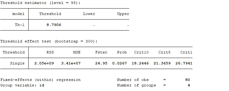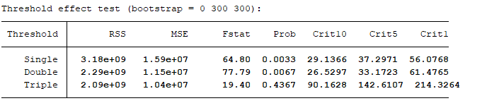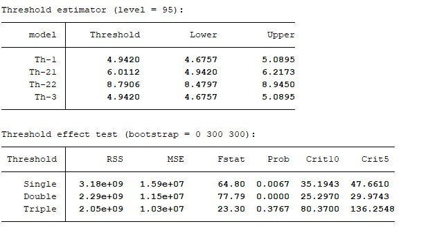 额,我刚刚懂了。谢谢老师。另外老师,我还有两个个问题1、我这个进行的如图所示单门槛检验,显示的没有门槛上限和下限,根据您回答的别人的贴子,我对grid()网格数和trim()进行了调整,直到大概grid(200),trim(0.1)才能显示上下限,请问这样的情况怎么处理呢,因为trim(0.1)不太符合常理。2、门槛模型前面的稳定性检验以及hausman检验的使用情况,我搜到的相关情况是,时间序列数据用平稳性检验,面板数据用hausman检验,但是我看的别人的面板数据为什么只有平稳性检验没有hausman检验呢?辛苦老师了