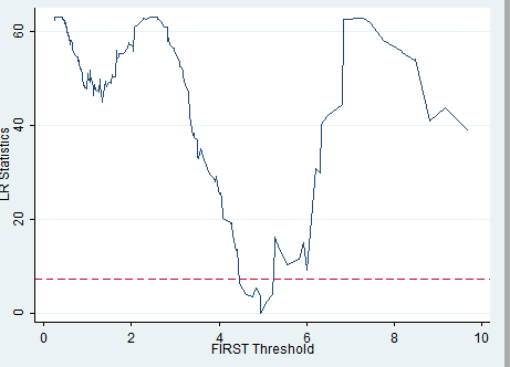 _matplot e(LR), columns(1 2) yline(7.35, lpattern(dash)) connect(direct) msize(small) mlabp(0) mlabs(zero) ytitle("LR Statistics") xtitle("FIRST Threshold") recast(line)单门限画图代码