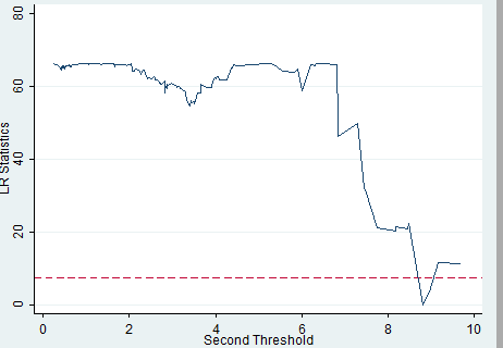谢谢老师了,我刚刚按照您的步骤,发现双门槛模型做出来的检验结果是通过的,但是做LR图发现是双门限的时候,虚线下面的点应当是6.0112和8.7906左右,但是我画出来的图只有在8.7906,请问这个怎么解释呢?感谢老师