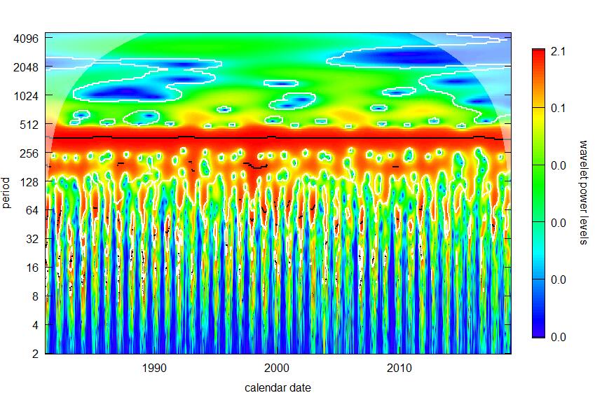wt.image(mydata, legend.params = list(lab = "wavelet power levels"), periodlab = "period",show.date = TRUE, date.format = "%Y")