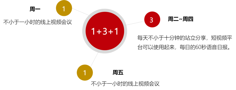 我们可以采用1+3+1的模式。“1”是周一要有不小于一小时的线上视频会议,在会上要重申防疫规范,布置这一周的关键任务以及关键行为,“3”是周二到周四,每个员工每天不少于10分钟的站立分享,既可以分享他们做的事,也可以分享自己的一些发现。
