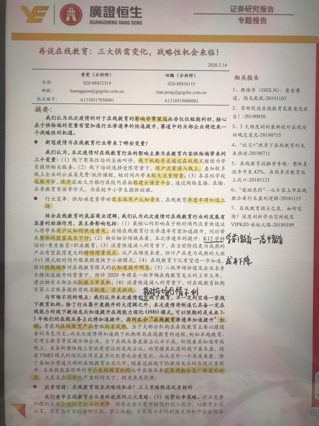 基于以上分析,可以将分析放在可持续追踪的运营或财务指标,包括1、盈利能力的跟踪:毛利率、净利率、经营净现金流2、市占率3、运营效率:保障教学质量及服务体验下的最大生师比、销售费用投入产出比、转化率、满班率、续费率、退费率。在此基础上,我们建议重点关注各细分领域头部优质在线培训类标的,其具有较强的教研、教学服务、运营能力,短期流量涌入承接能力、有望留存用户进一步提升自身体量。比如学而思网校-好未来(TAL.N)、跟谁学(GSX.N)、新东方在线(1797.HK)等,以及产业中优质尚未上市的优质企业猿辅导、作业帮等,关注其pre-IPO,上市前招股等信息。同时建议关注toB类教育服务输出企业,尤其是在技术输出的背景下具备内容输出能力的企业,短期内用户将持续涌入,长期需跟踪其用户留存能力,关注Classin-翼鸥教育、爱学习教育集团等