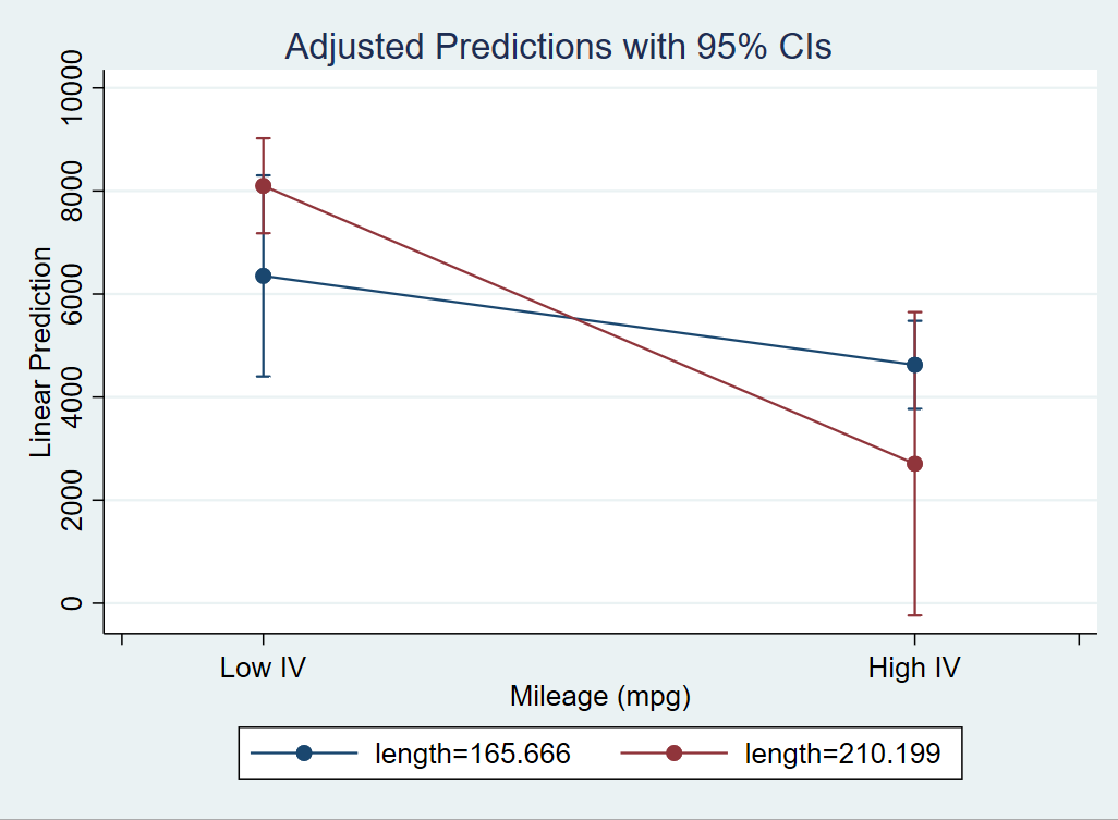 - marginsplot, xlabel(13 " " `low_mpg' "Low IV" `high_mpg' "High IV" 30 " ") ///